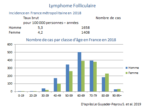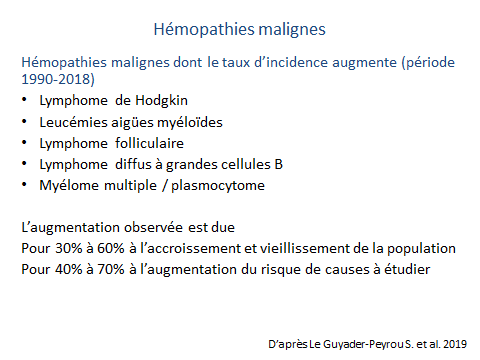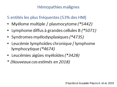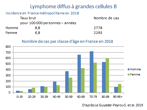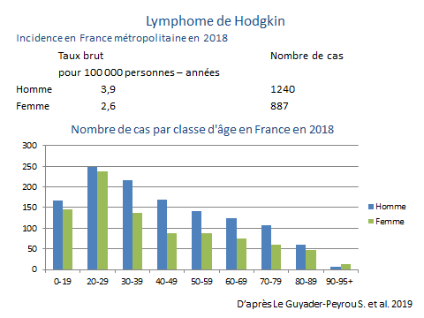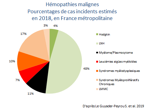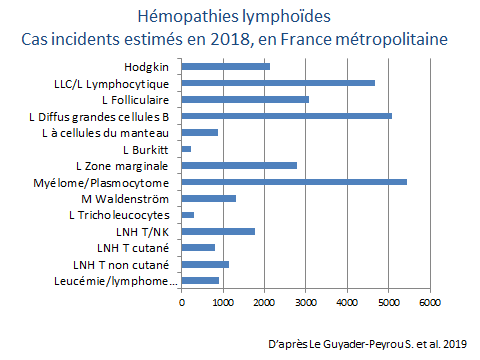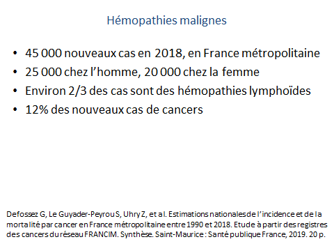 Le Guyader-Peyrou S, Defossez G, Dantony E, et al. Estimations nationales de l’incidence et de la mortalité par cancer en France métropolitaine entre 1990 et 2018. Etude à partir des registres des cancers du réseau FRANCIM. Volume 2 – Hémopathies malignes. Saint-Maurice : Santé publique France, 2019. 147 p.