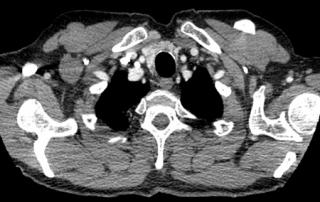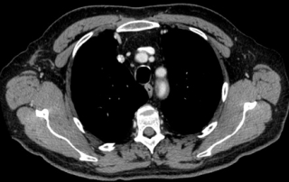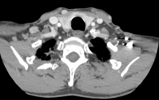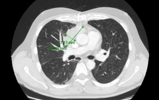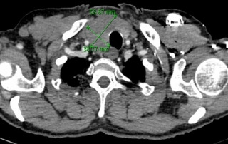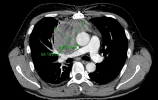 Scanner thorax abdomen pelvien : masse médiastinale antérieure et supérieure, absence d’atteinte du pédicule vasculaire, absence de nodule pulmonaire, scanner sous-diaphragmatique normal. Cible médiastinale taille 94 x 67 mm