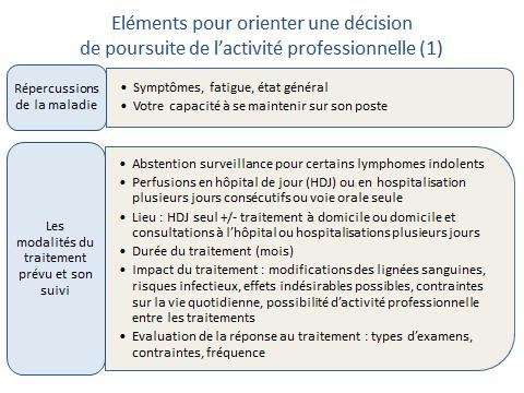 Lors du diagnostic de lymphome ou après traitement, pour les personnes en activité professionnelle, la décision du maintien en emploi ou du retour à l’emploi peut poser de nombreuses questions. Être bien informé et accompagné, effectuer une démarche personnelle contribuent à trouver une solution adaptée à votre situation. Les réponses apportées aux questions soulevées avec votre médecin et le médecin du travail prendront en compte plusieurs aspects de votre vie quotidienne : les répercussions physiques et psychologiques de la maladie, les traitements prévus ou reçus, le type d’activité professionnelle, le contexte familial et social ainsi que vos souhaits personnels.