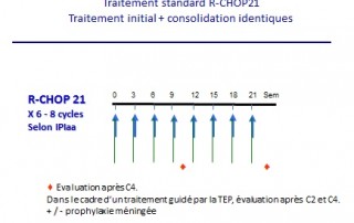 Traitement initial R-CHOP-21(intervalle 20 jours) x 4 cycles et consolidation identiques R-CHOP x 2 – 4 cycles, soit selon IPIaa un total de 6 cycles (IPIaa = 0), ou 8 cycles (IPIaa = 1, 2 ou 3).